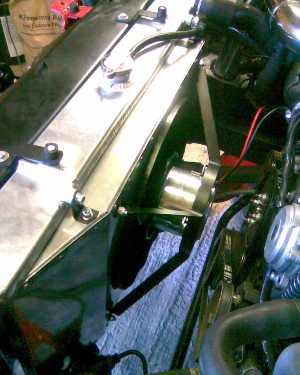 Termostat mám 82°C a termospínač jednostupňový zap 87°C vyp 82°C v horní hadici, vrtule 355mm 350W v al. sahaře vlastní konstrukce, al. chladič 50mm a řekl bych, že více už netřeba, experimentoval jsem s motorem 450w otáčky odhaduju okolo 3500 a 360mm vrtulí původně určenou pro visco spojku z passata a to jsem měl dojem, že to už to auto utáhne samo i bez cačka, bohužel problém byl v tom, že se mi celkem hřály spoje/fastony a relé, taky to bylo už celkem velké/nemotorné a hlavně se mi to nepodařilo dokonale vyvážit, takže to trochu vibrovalo, ale když to seplo a člověk stál za autem, tak mu vlály nohavice